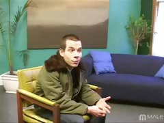 Cock starved blonde gay Rob giving blowjob on the couch in